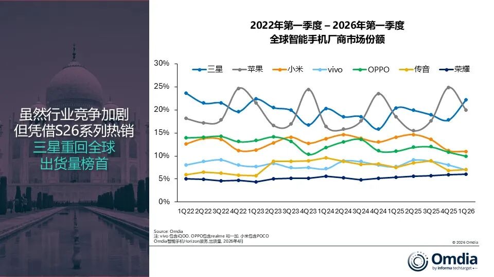 三星逆势稳住全球第一厂商地位,一季度出货6540万台,同比增幅8%。产品线高低端双线发力韧性十足:A系列入门机型稳固新兴市场大盘,Galaxy S26系列热销则带动高端市场销量攀升。
