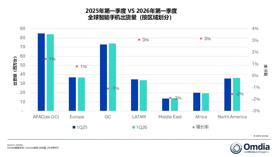 OPPO(含realme、一加)以3070万台出货量位列第四,同比下降6%;vivo排名第五,出货2130万台,同比下滑7%。两大中国品牌一季度均录得个位数跌幅,主要受2025年末入门机型集中铺货、今年一季度终端走货放缓影响。