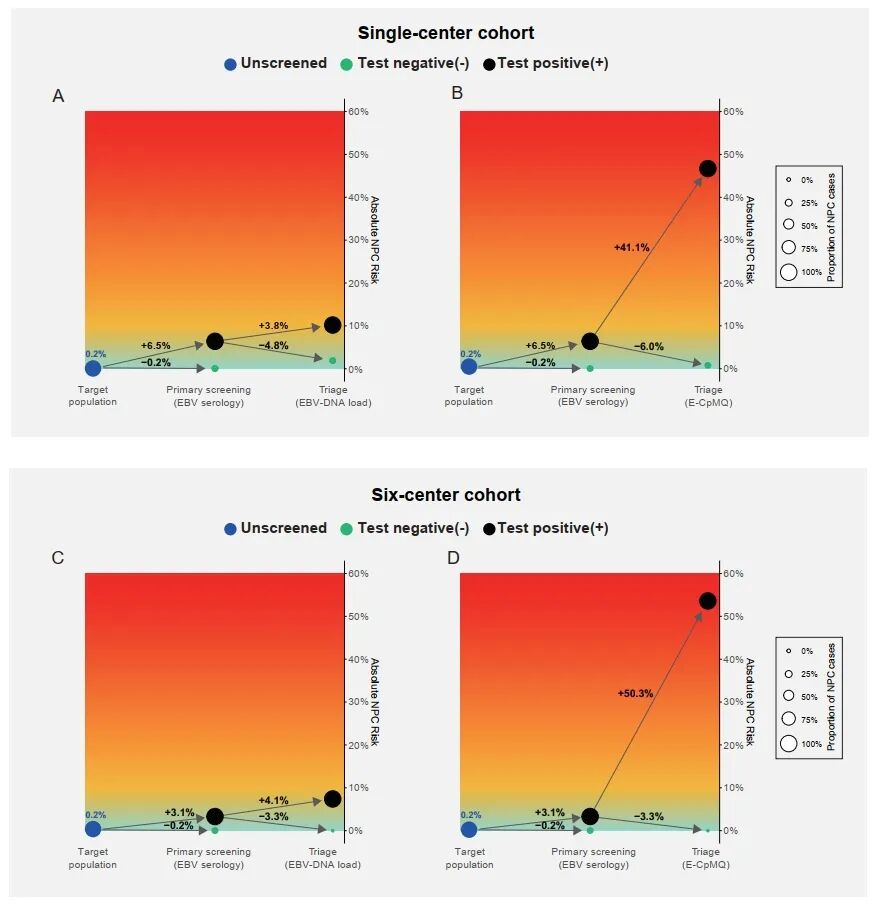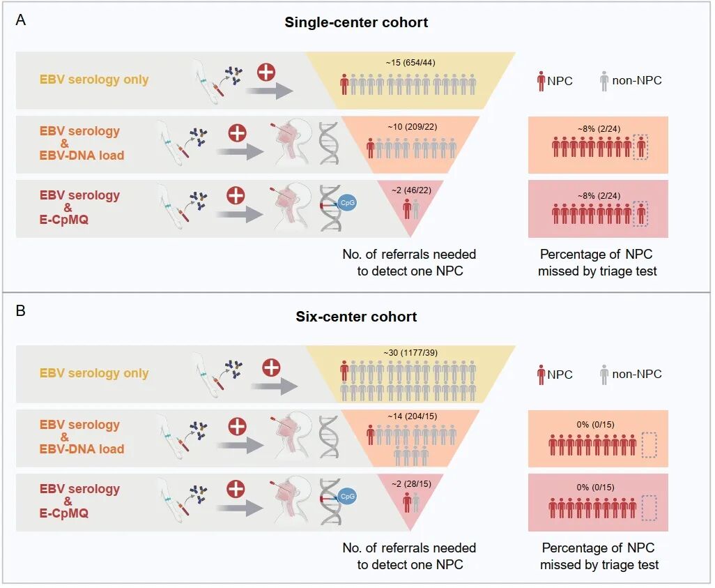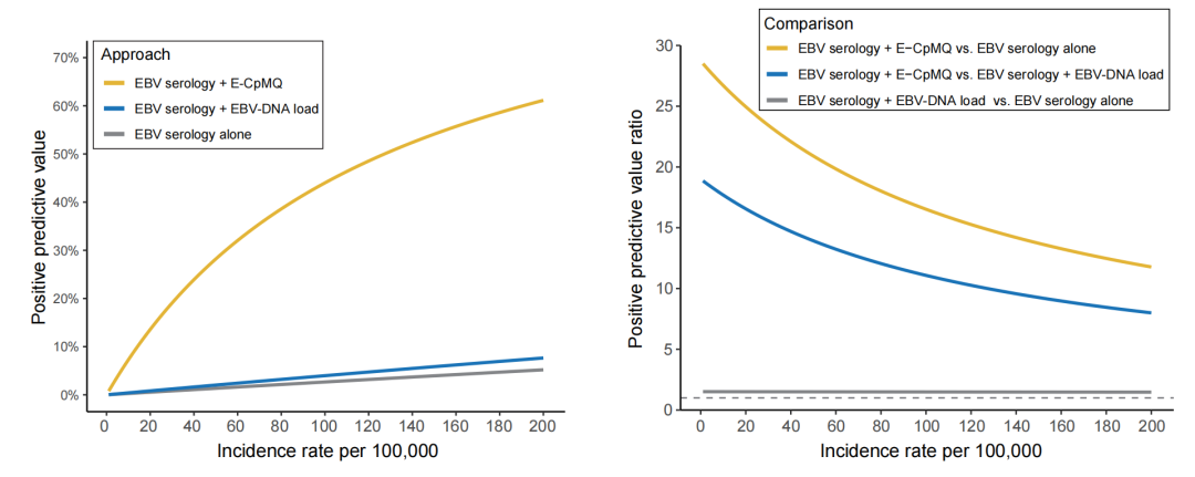 通过构建了“EB病毒血清学初筛+E-CpMQ二次分流”的两步筛查模型,可将整体筛查特异度由单纯EBV血清学筛查的97.0%提升至99.9%,同时显著提高阳性预测值(PPV)。在鼻咽癌发病率分别为10/10万、50/10万和100/10万人群中,PPV分别达到7.3%、28.2%和44.0%,远高于单纯血清学筛查(0.3%、1.3%、2.6%)及血清学联合EBV-DNA方案(0.4%、2.0%、4.0%)。