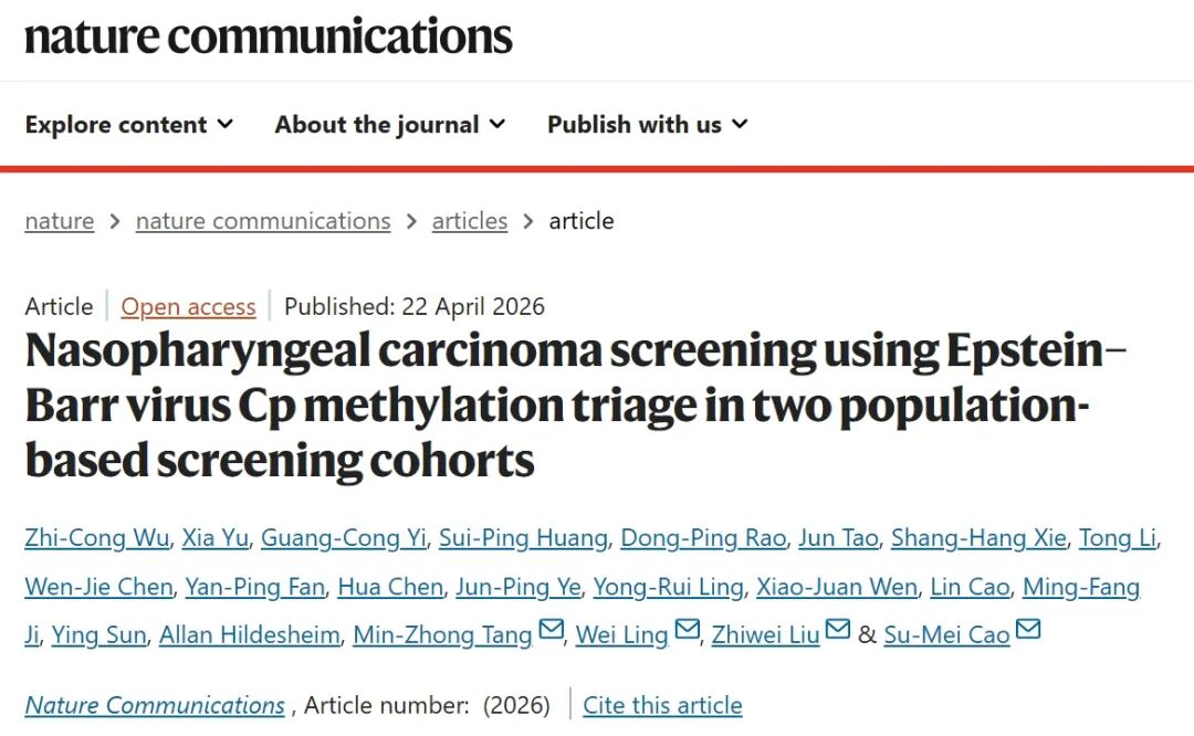 2026年4月13日,曹素梅教授团队联合凯普生物(300639)及多家机构,在国际权威期刊《Nature Communications》进一步发表E-CpMQ技术的最新研究成果,依托两项总计55682例受试者的独立人群筛查队列,涵盖了我国六大鼻咽癌高发城市(中山、四会、顺德、江门、梧州、苍梧),系统性验证了自主研发的EB病毒Cp启动子甲基化定量检测技术(E-CpMQ)在鼻咽癌血清学高危人群分层分流中的应用价值,为鼻咽癌精准早筛提供全新的解决方案。
