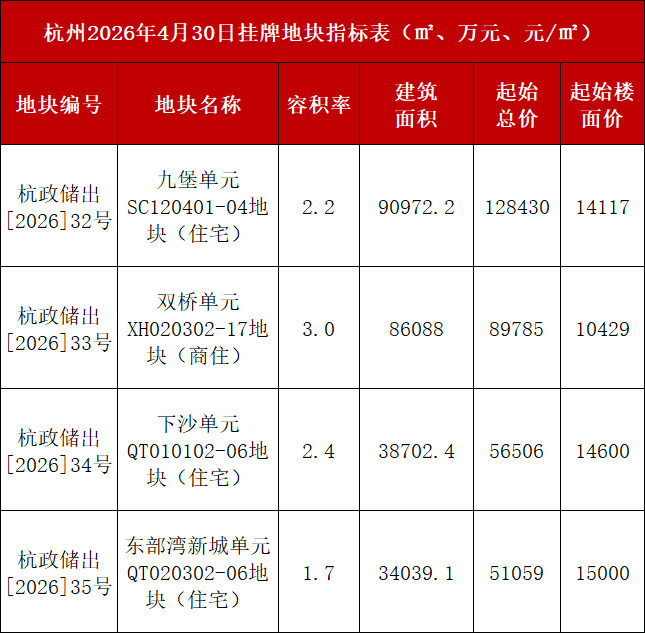 01杭州市区4月30日挂牌4宗涉宅用地,预计6月3日出让,本月累计挂牌8宗,可建体量约60万㎡。