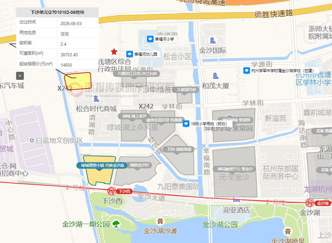 钱塘区挂牌2宗地块,其中下沙单元QT010102-06地块,出让面积16126㎡,容积率2.4,可建面积约3.9万㎡,起始楼面价14600元/㎡,目前地块所在的金沙湖北侧近绿城理想小镇.月映金沙庭在售,销售成绩较优,其余项目均已售罄,未来竞争压力不大。