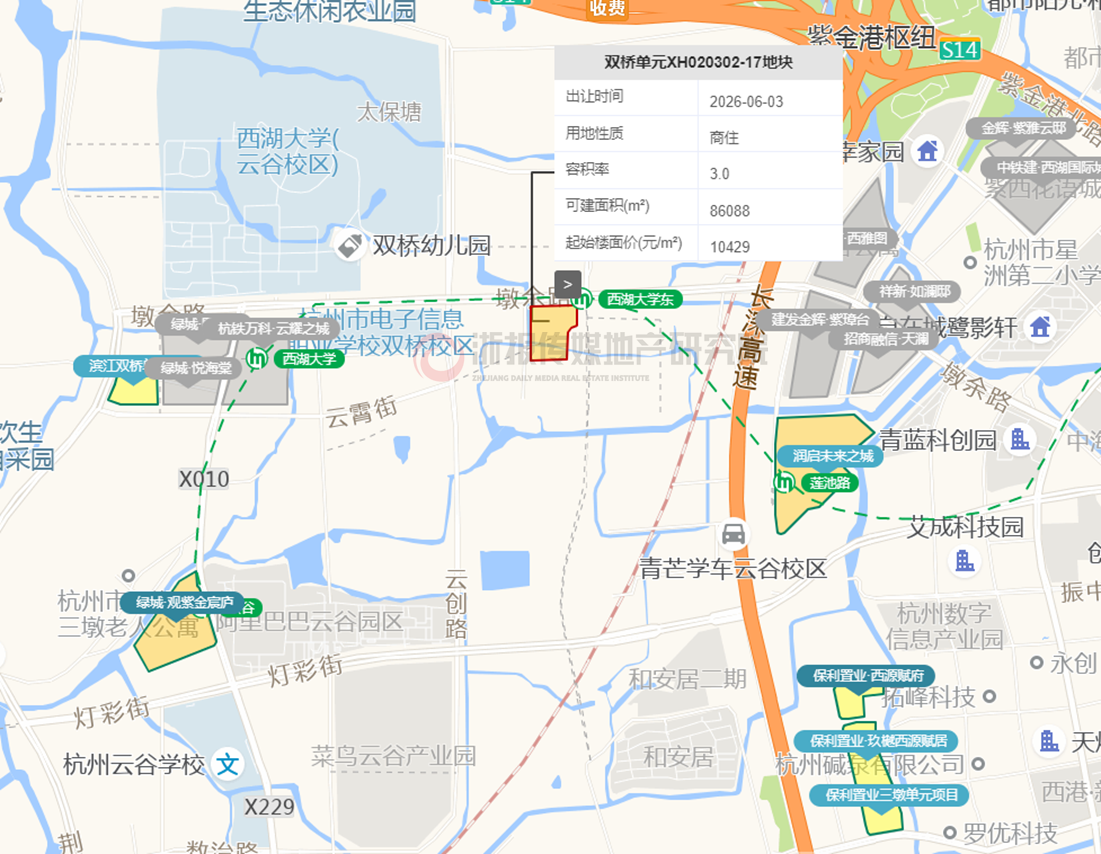 04西湖区双桥地块住宅起始楼面价13487元/㎡,较上月同类地块涨幅12.6%,地铁优势明显。