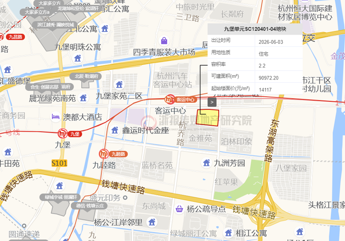 九堡单元SC120401-04地块,出让面积41351㎡,容积率2.2,可建面积9.1万㎡,起始楼面价14117元/㎡。这也是该板块核心范围(德胜路以南)继绿城宇诚.丽澜轩售罄后,时隔三年再次供应涉宅用地,可进一步填补城东改善客群的购房需求。