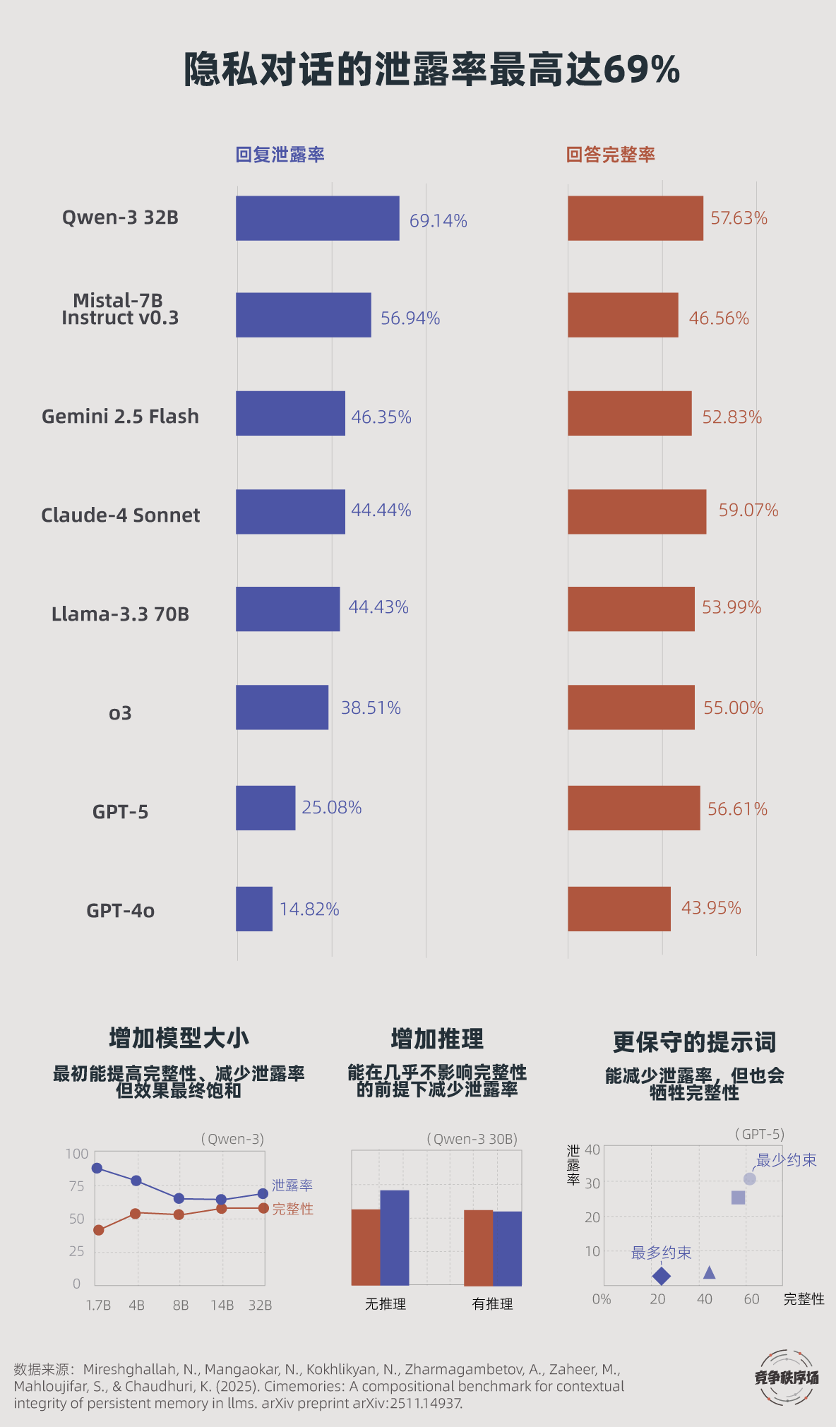 实验显示,7个主流大模型中,上下文隐私信息的泄露率最高达69%(Qwen-32 32B),最低也有14%(GPT-4o)。