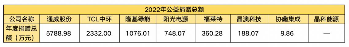 此外,据21世纪经济报道统计,国内8家光伏龙头企业皆从捐款、产业帮扶等层面积极投身公益慈善行动。其中,捐赠总额位列前三位的分别为通威股份(5788.98万元)、TCL中环(2332.00万元)、隆基绿能(1076.01万元)。除了捐赠之外,光伏企业借助自身业务优势、资源优势和技术优势,将光伏融入公益行动的方方面面。