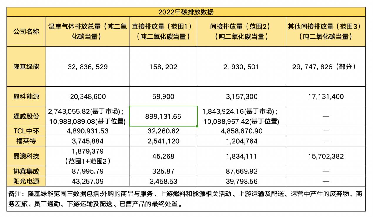 ESG报告中,环境方面,碳排放是重点关注对象。在21世纪经济报道记者统计的8家光伏企业中,2022年温室气体排放总量排在前五名的企业,分别是隆基绿能、晶科能源、通威股份、TCL中环、福莱特。