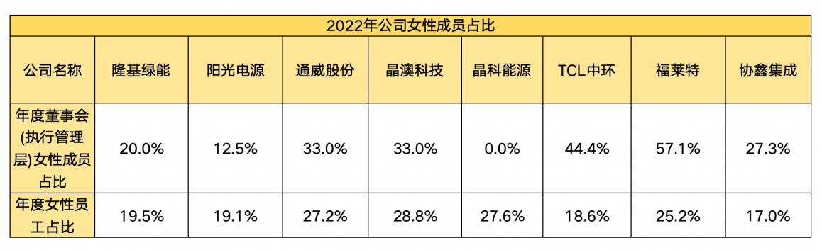 据21世纪经济报道统计,2022年,我国8家光伏龙头企业中,董事会(执行管理层)女性成员占比排名前四的分别是福莱特(57.1%)、TCL中环(44.4%)、通威股份(33.0%)、晶澳科技(33.0%),除晶科能源、阳光能源外,其他6家企业占比均超过中国内地企业董事会女性成员占比平均值(13.1%),一定程度上可以说明新能源企业对于性别多元化议题的重视。