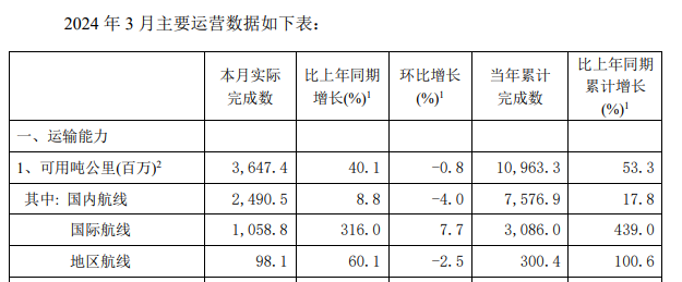 图为:中国国航2024年3月运营数据
