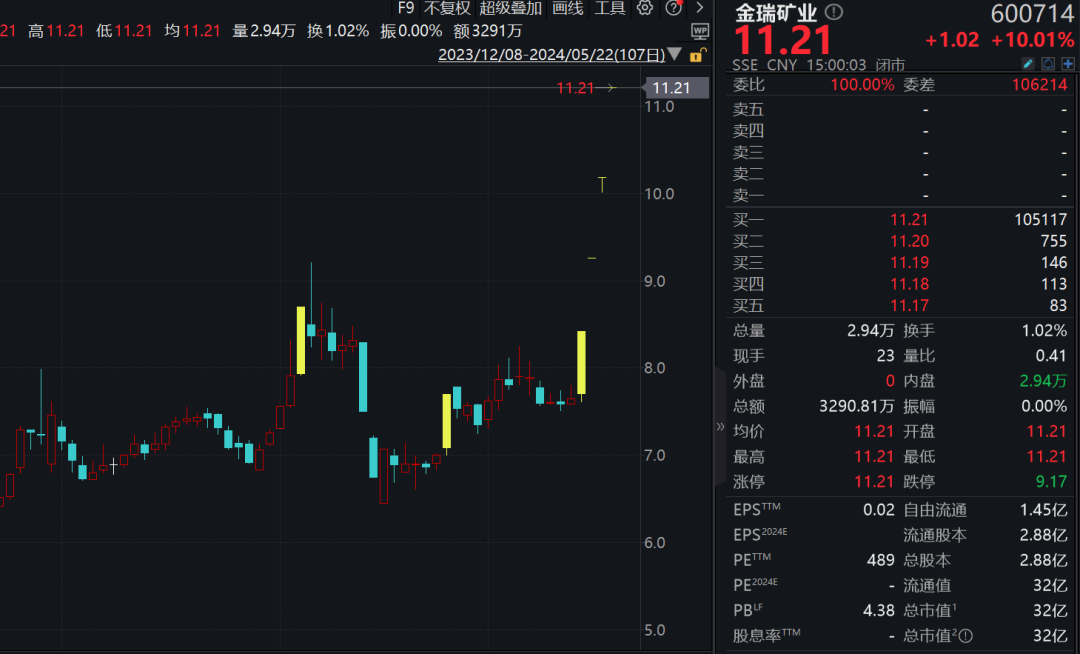 5月21日晚,金瑞矿业发布股价异动公告称,截至 2024 年 5 月 21 日收盘,公司股票动态市盈率、市净率与同行业相比处于较高水平,股价剔除大盘整体因素后的实际波动幅度较大,除已披露事项外,公司及控股股东不存在应披露而未披露的重大信息,目前,公司及下属子公司生产经营情况正常,不存在影响公司股票交易价格大幅波动的重大事项。