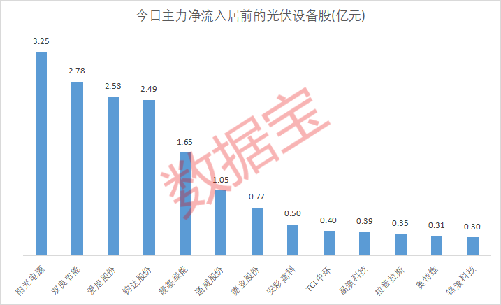 从今日主力资金净流入额来看,阳光电源(300274)、双良节能、爱旭股份、钧达股份、隆基绿能(601012)、通威股份6股过1亿元,依次为3.25亿元、2.78亿元、2.53亿元、2.49亿元、1.65亿元、1.05亿元。