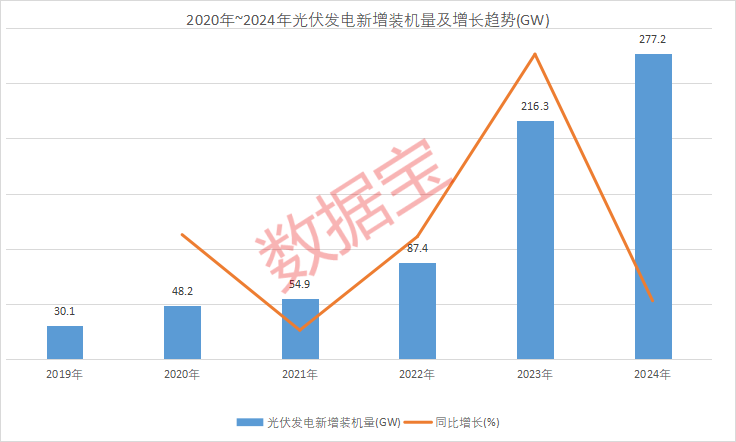 根据国家能源局数据,截至2024年底,全国太阳能发电累计装机容量88666万千瓦,与2023年底相比增长27717万千瓦,增速28%。虽然总量续创新高,但增速大幅回落。2022年全年新增装机量同比增长59%,2023年同比增长147%。