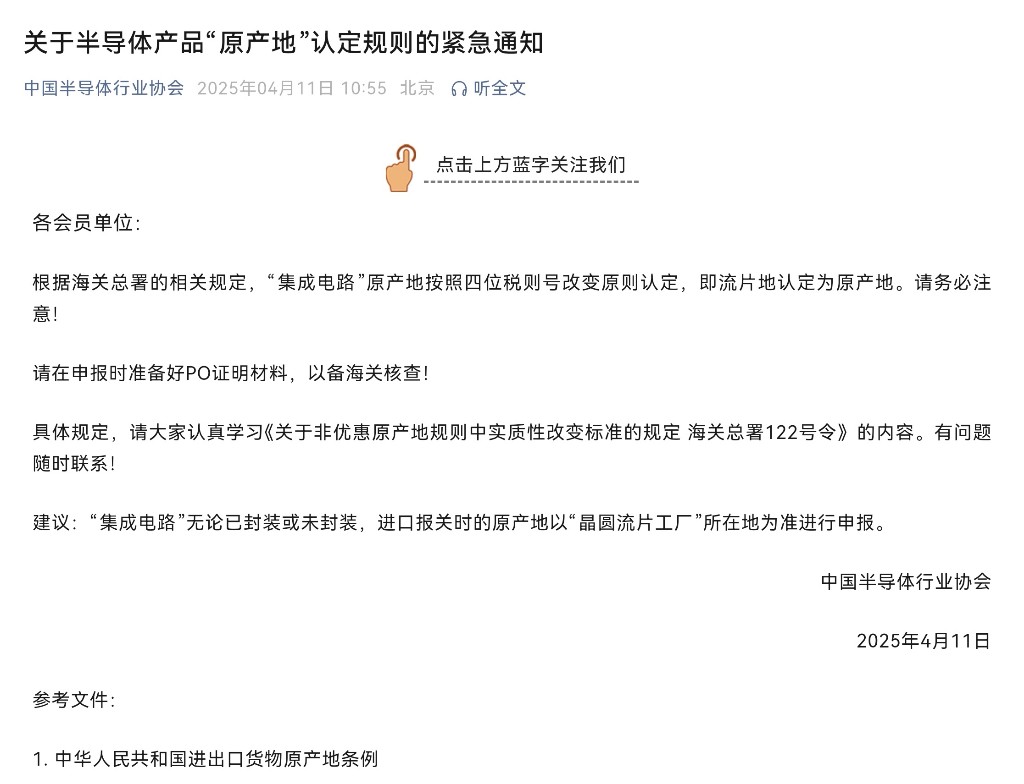 4月11日,中国半导体(881121)行业协会发布《关于半导体(881121)产品“原产地”认定规则的紧急通知》。通知提示:根据海关总署的相关规定,“集成电路”原产地按照四位税则号改变原则认定,即流片地认定为原产地。请在申报时准备好PO证明材料,以备海关核查。具体规定,请大家关注《关于非优惠原产地规则中实质性改变标准的规定海关总署122号令》的内容。