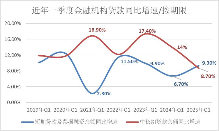 但是今年有所不同。央行最新数据显示,分期限看,2025年一季度末的短期贷款及票据融资余额60.69万亿元,同比增长9.3%;中长期贷款余额115.24万亿元,同比增长8.7%,一季度增加5.53万亿元。在增速上,短贷超越了中长期贷款。
