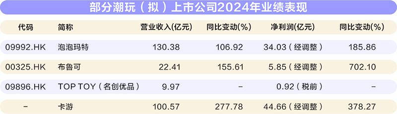 名创优品(09896.HK)旗下的潮玩零售品牌TOP TOY,2024年实现营收9.97亿元,同比大幅增长;税前利润为9242.8万元。集换式卡牌龙头——卡游业绩也十分亮眼,2024年实现营收100.57亿元,同比增长277.78%;经调整净利润为44.66亿元,同比增长378.27%。公司目前正在冲刺港股上市。
