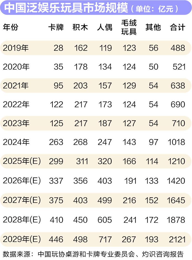 中国潮玩产业规模已经步入千亿级。根据中国玩协桌游和卡牌专业委员会数据,中国泛娱乐玩具市场规模已突破千亿元大关,2024年合计达到1018亿元,预计2029年将突破2000亿元,达到2121亿元。