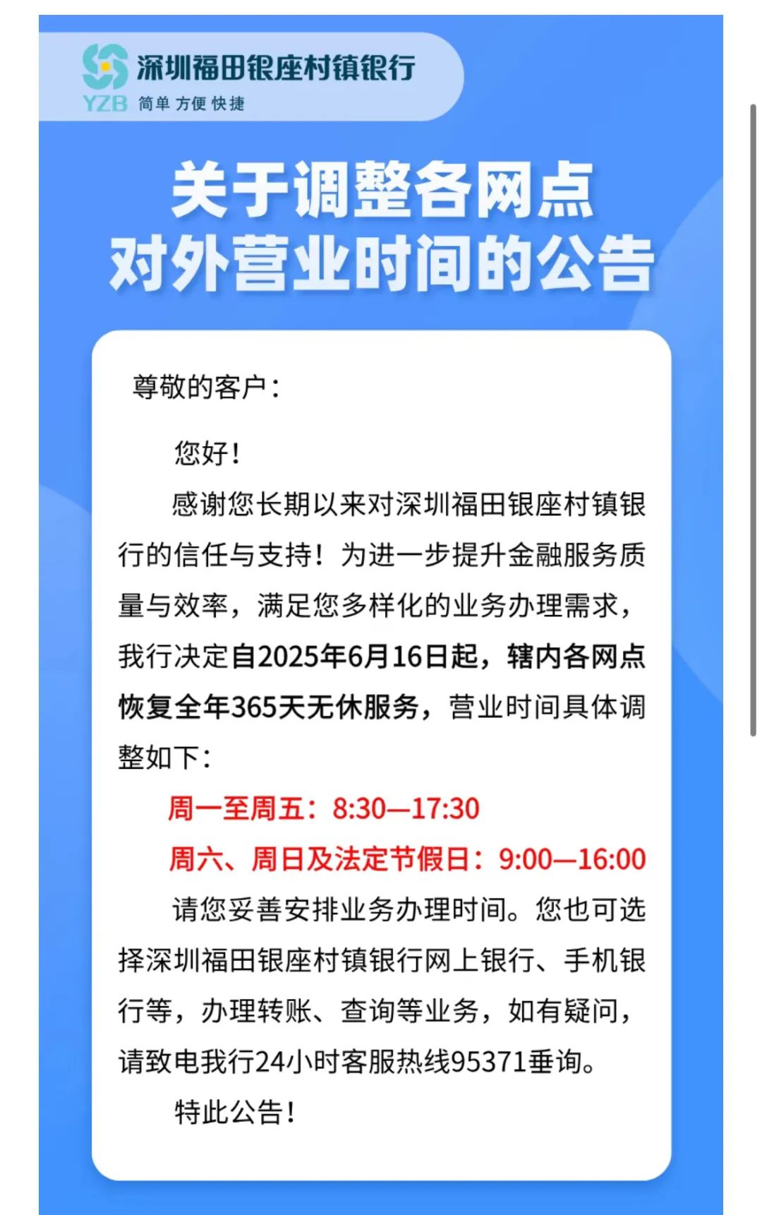 “为进一步提升金融服务质量与效率,满足您多样化的业务办理需求,我行决定自2025年6月16日起,辖内各网点恢复全年365天无休服务。”近日,深圳福田银座村镇银行发布了一条关于调整各网点对外营业时间的公告,在业内引发热议。