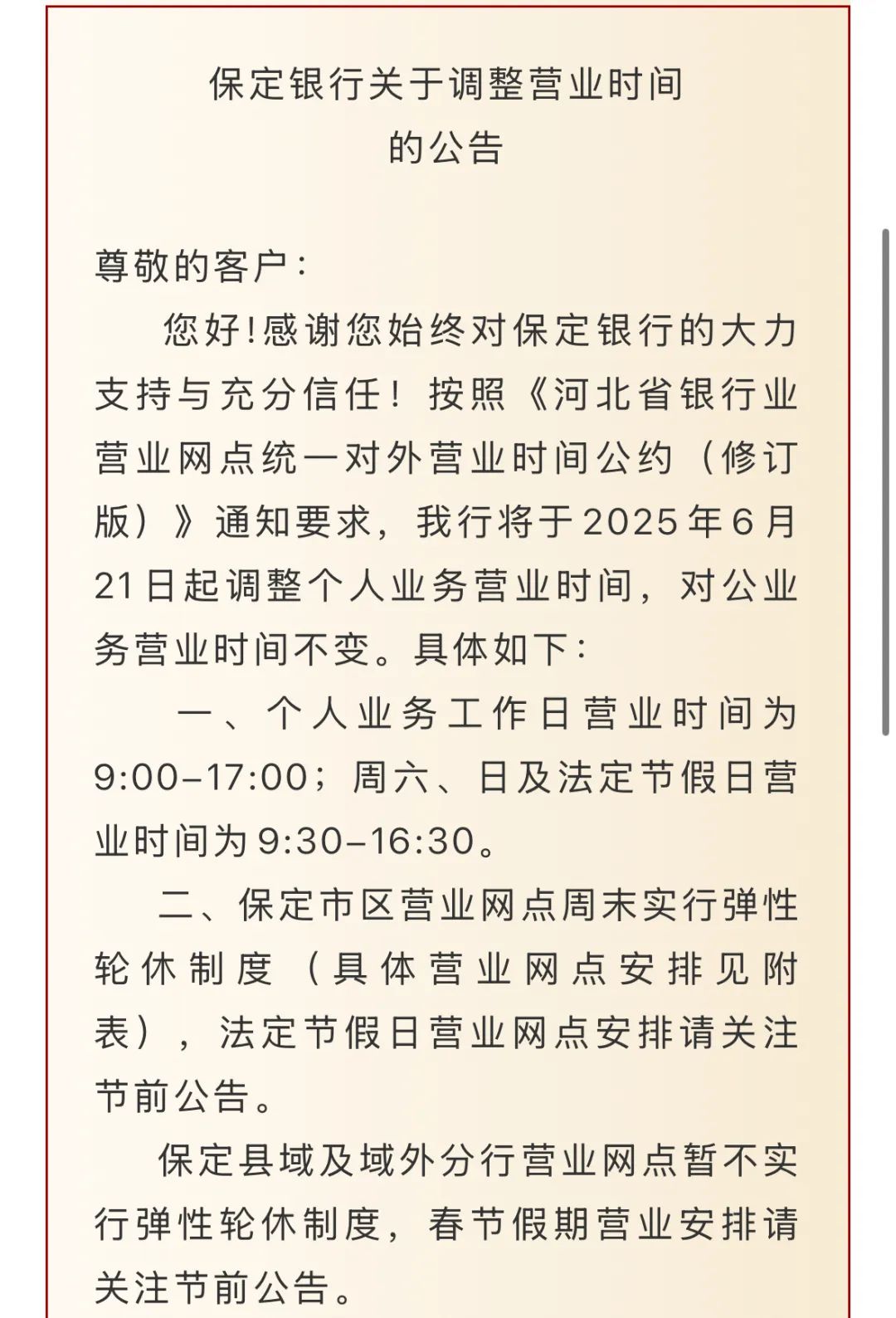 6月13日,保定银行发布的《关于调整营业时间的公告》显示,该行于6月21日起调整个人业务营业时间,对公业务营业时间不变。具体来看,保定银行个人业务工作日营业时间为9:00-17:00;周六、日及法定节假日营业时间为9:30-16:30。