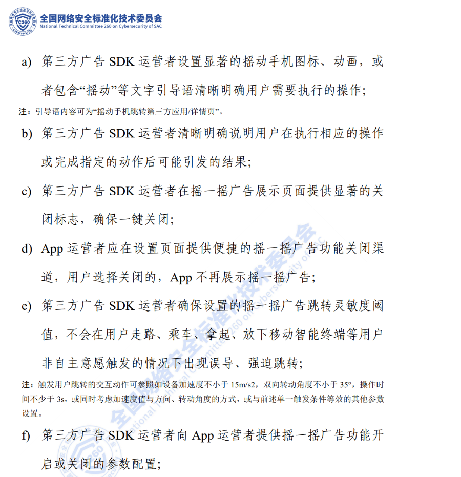 比如,2022年,电信终端产业协会在工信部指导下发布了《App用户权益保障测评规范》,要求App信息窗口不能欺骗性跳转,并具体设定了“摇一摇”广告的触发门槛:加速度不小于15m/s2,转动角度不小于 35°,操作时间不少于 3s。
