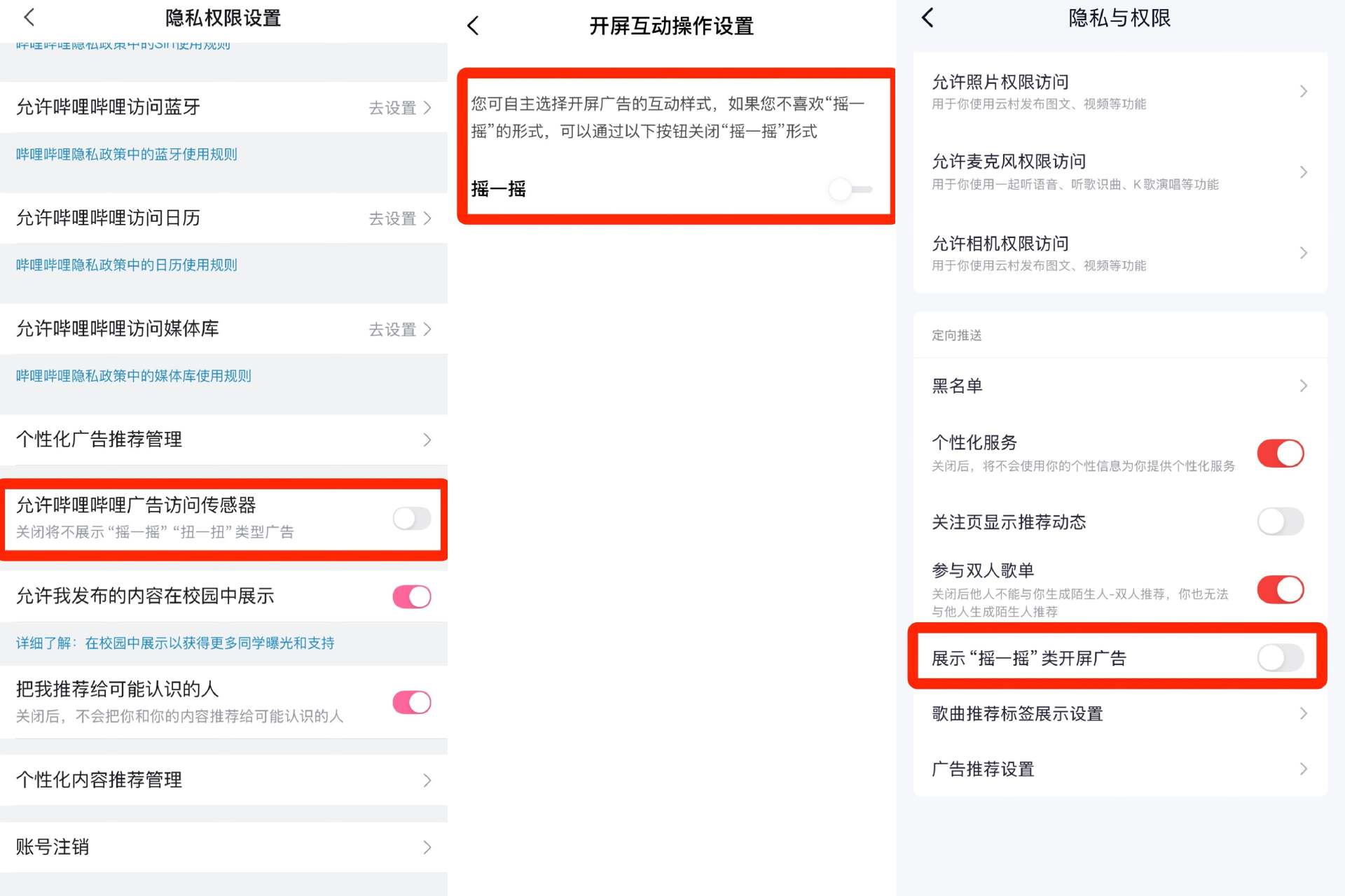 (从左至右分别为:哔哩哔哩、番茄小说、网易云音乐的摇一摇广告关闭通道)