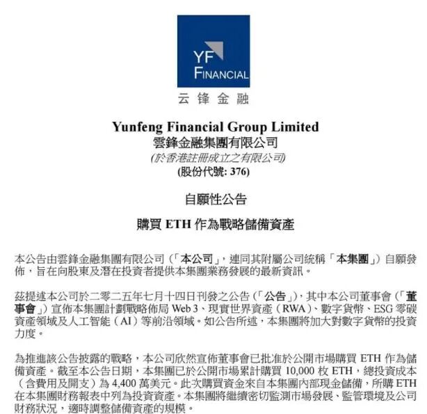 9月2日,云锋金融公告,董事会已批准在公开市场购买ETH作为公司储备资产。截至公告日,集团已累计购入1万枚ETH,总投资金额为4400万美元(约人民币3.14亿元),资金全部来自集团内部现金储备。未来,公司还将持续增加在数字资产方面的投入比重。