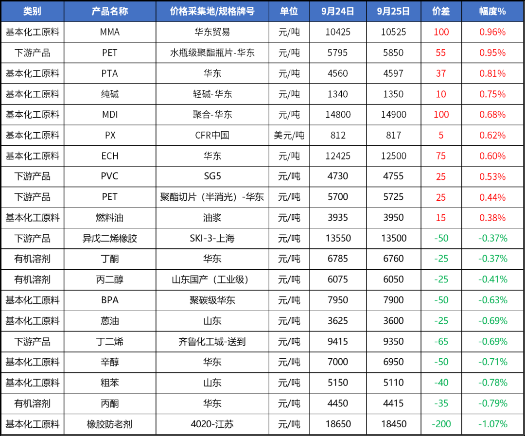 在卓创资讯(301299)监测的109个产品之中,本周期有17个产品上涨,占比15.60%;71个产品持稳,占比65.14%;21个产品下降,占比19.27%。上涨的前三名产品为MMA、PET、PTA,涨幅分别0.96%、0.95%、0.81%;下跌前三名产品为橡胶防老剂、丙酮、苯酐,跌幅分粗苯别为1.07%、0.79%、0.79%。