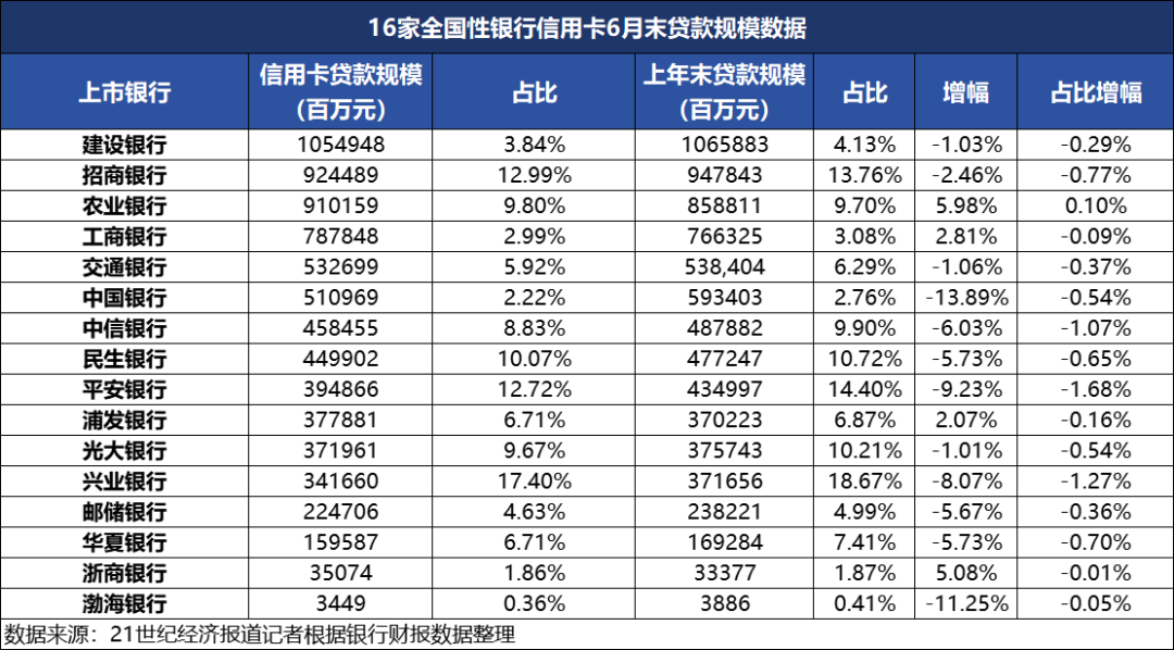 21世纪经济报道记者梳理了包括6家国有大行、10家股份制银行共16家全国性银行半年报数据发现,整体来看,16家银行在信用卡贷款规模、累计发卡量、交易金额等方面依然呈现下滑趋势,上半年信用卡业务规模仍在下滑,16家全国性银行信用卡贷款规模较年初减少1945亿元。