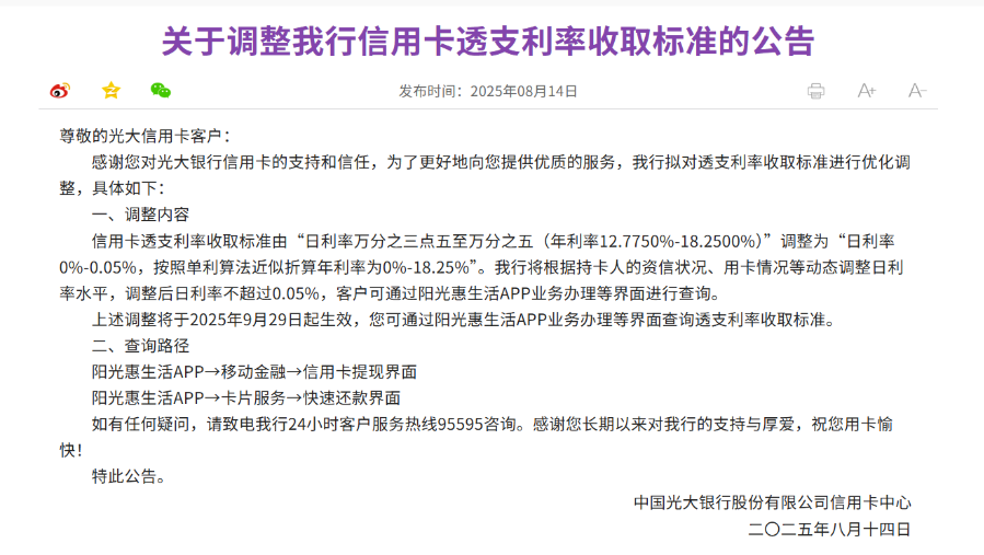 近日,多家银行对信用卡透支利率标准进行调整,打破0.05%的透支利率标准。光大银行(601818)近期发布的公告显示,该行将信用卡透支利率收取标准由“日利率万分之三点五至万分之五(年利率12.7750%-18.2500%)”调整为“日利率0%-0.05%,按照单利算法近似折算年利率为0%-18.25%”。这一优化调整将于9月29日起正式生效。