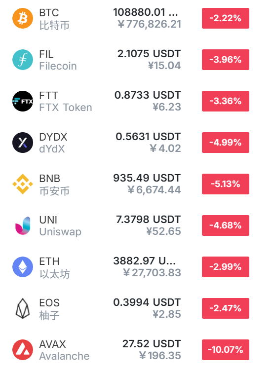 9月26日,全球主要加密货币迎来普遍下跌,延续了本周以来的加密货币大幅回调的势头,比特币跌破11万美元,以太坊跌破3900美元关口,创近七周新低。截至记者发稿,比特币下跌2.22%,以太坊下跌2.99%。