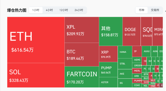 CoinGlass显示,近24小时全球共有近29万人爆仓,爆仓总金额超8.82亿美元。值得关注的是,以太坊投资者取代了比特币,成为爆仓金额最大的加密货币。爆仓热力图显示,以太坊、Solana和XPL爆仓规模位于前三位。