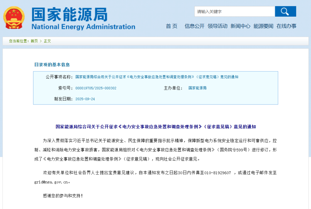 9月24日,国家能源局综合司关于公开征求《电力安全事故应急处置和调查处理条例》(征求意见稿)意见的通知。