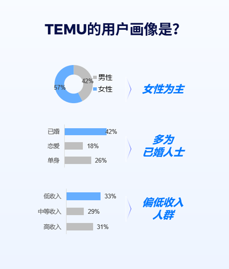 TEMU凭借其平台特性,精准吸引了以女性、已婚有孩家庭为主的价格敏感型用户。中低收入家庭构成其核心客群,同时平台也逐步渗透至高收入群体,成为后者采购日用品和季节性商品的补充渠道。
