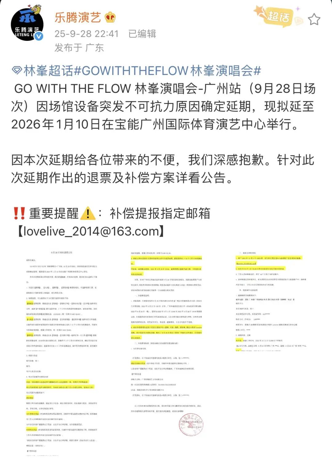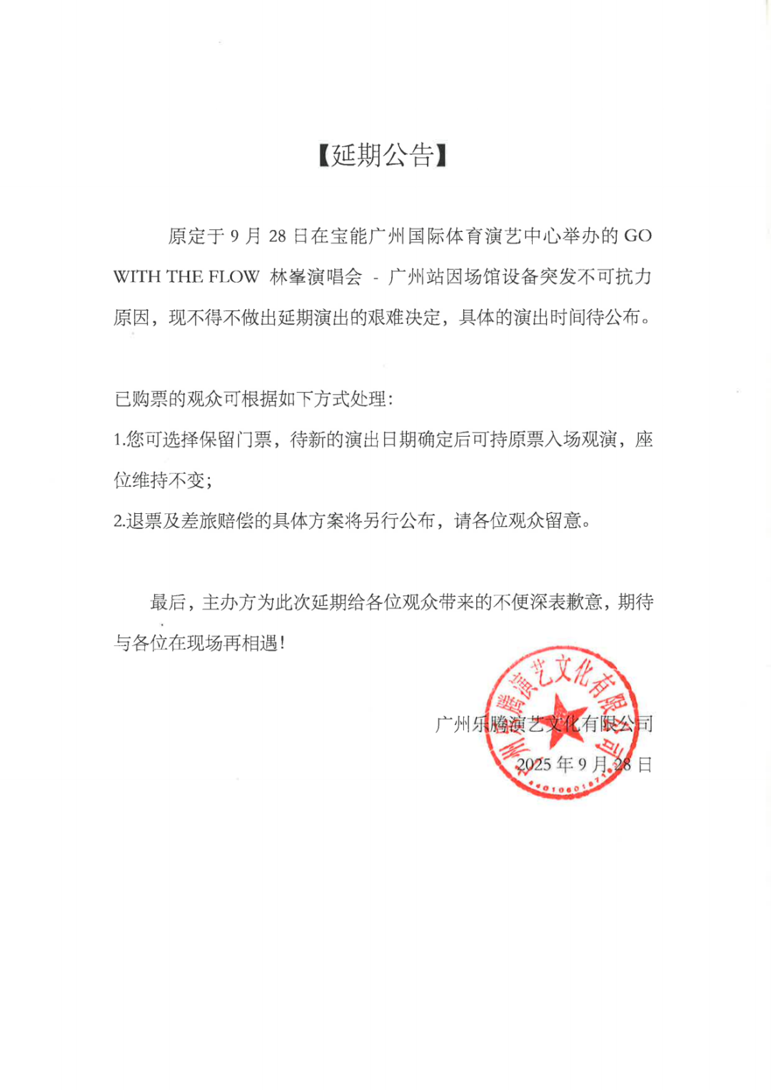 昨晚(9月28日),针对当天“GO WITH THE FLOW 林峯演唱会广州站”因场馆设备突发不可抗力而延期一事,主办方乐腾演艺发布公告,该场次拟延期至2026年1月10日在原场地宝能广州国际体育演艺中心举行,并公布了退票及补偿方案。