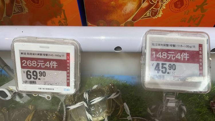此外,不少消费者也青睐去商超现场选购,9月29日,潇湘晨报.辣椒财经记者在洋湖天街温尔登超市,记者看到大闸蟹来自江苏兴化,25.8元一只,克重分别为(2.5母)、(3.5公)。