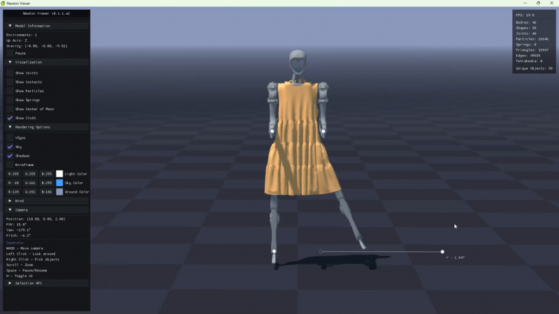 目前,简化版的Style3D求解器已经集成到Newton中。展望未来,我们计划为高级用户的规模化需求提供API,以便在Newton中运行完整版的Style3D求解器,实现具有数百万顶点的服装和软体仿真。