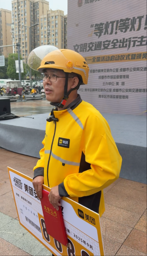 9月30日,记者获悉,近日,外卖平台“等灯!等灯”激励活动——十一全国活动启动仪式暨颁奖典礼在青羊区万达广场举行,成都市公安局交通管理局等单位领导也莅临现场,与外卖平台配送相关工作人员一起,对长期遵守交通规则的榜样骑手进行表彰。6位长期在配送过程中遵守交通规则的骑手,现场获得“大奖”,另有数十名骑手也因配送过程中严守交规而获得奖励。