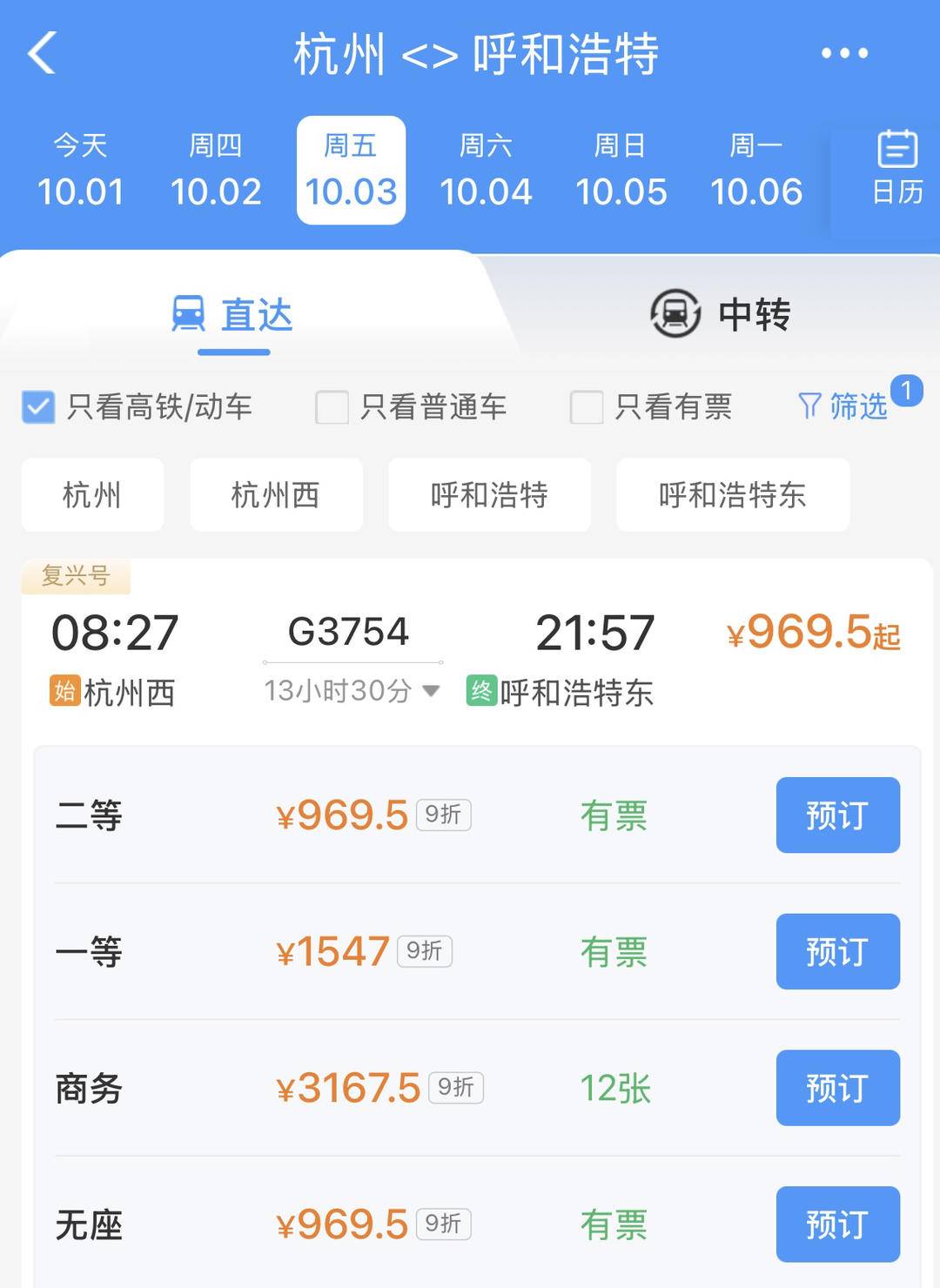 记者查询发现,G3754次列车始发站为杭州西站,终点站为呼和浩特东站,全程运行13小时30分钟,中途停靠25站,途经浙江、上海、江苏、河南、山西、内蒙古,售价969.5元,目前10月2日仅剩5张商务座车票。
