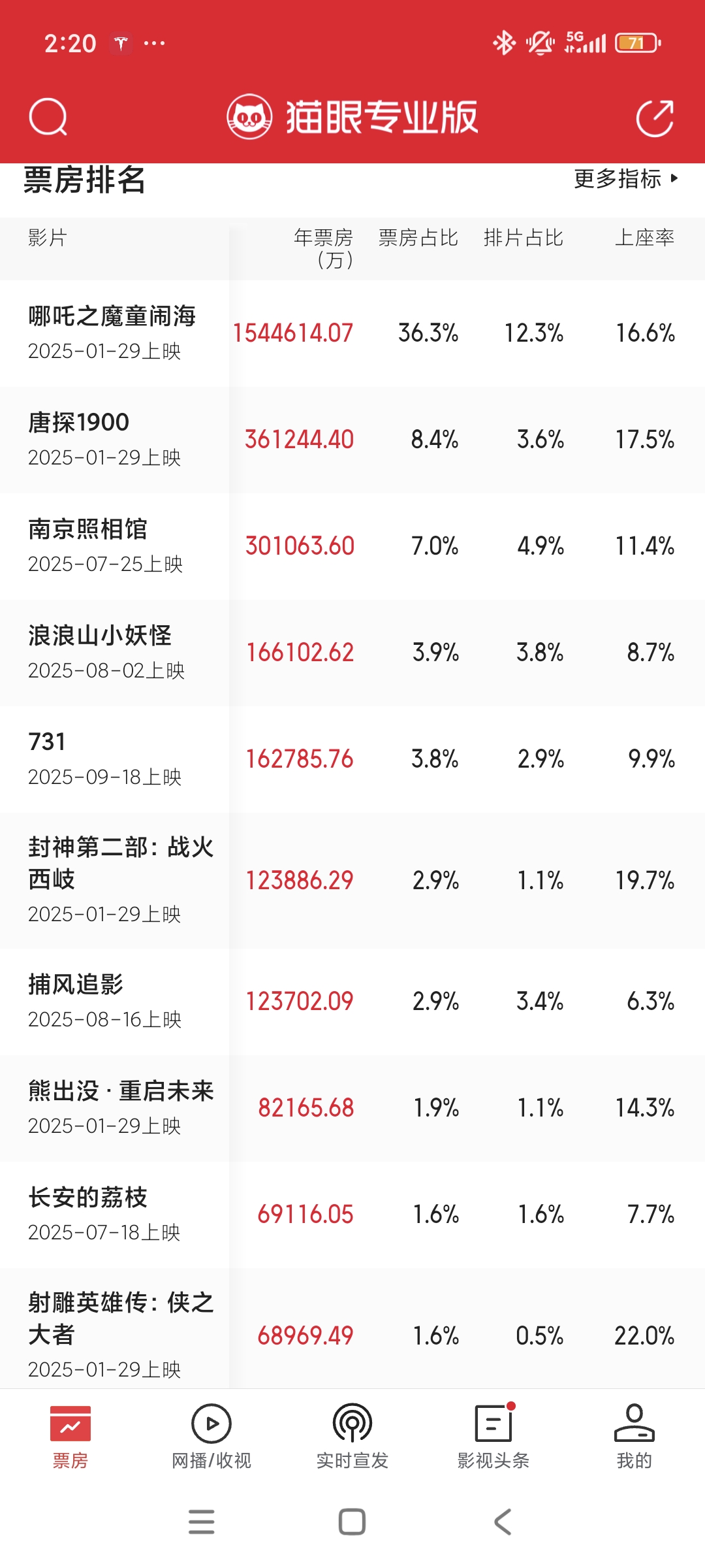 2025年度总票房已超去年全年 年度票房榜前十均为国产电影