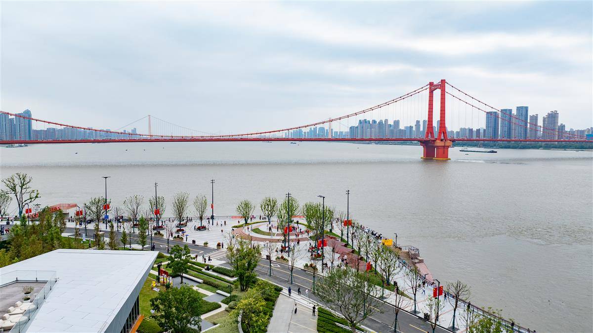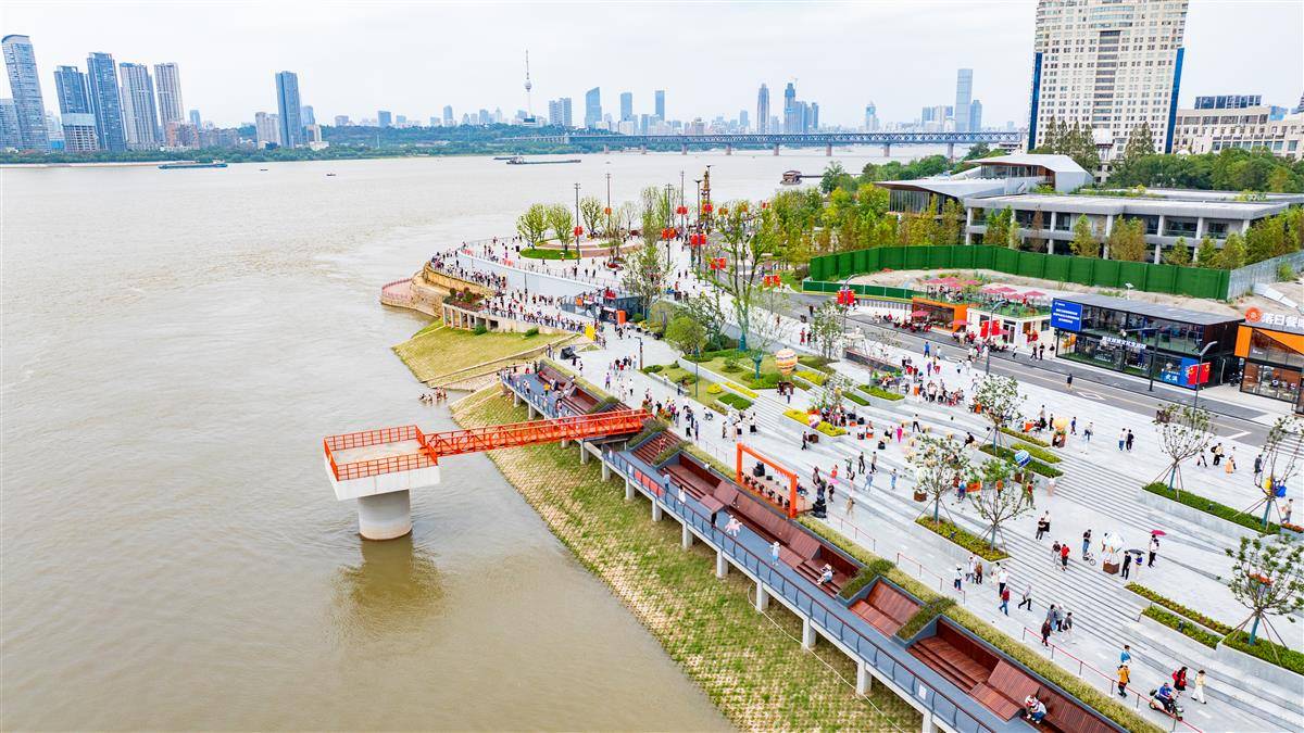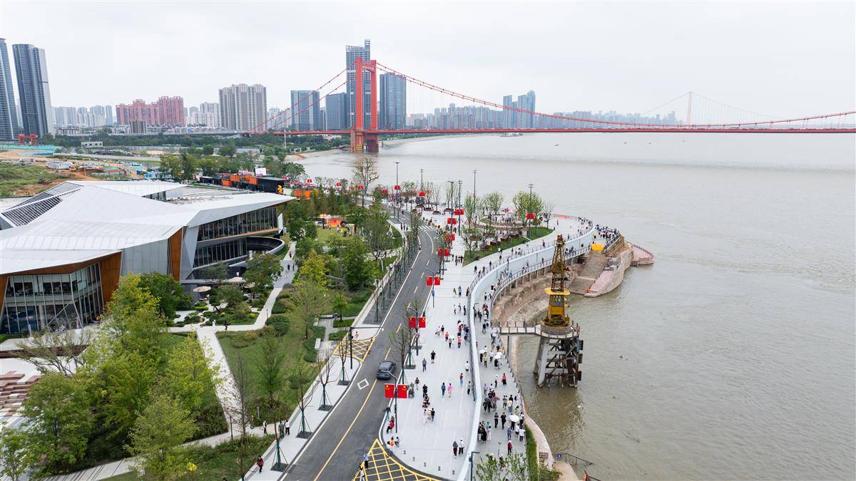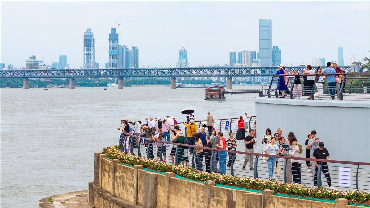 2025年10月3日,“十一”小长假第三日,大批市民游客来到新开放的武汉武昌湾1956公园,眺望长江,极目楚天!武昌湾1956公园位于老武昌城文昌门外,从张之洞路至解放闸(巡司河口),全长约1.1千米。和其他江段的江滩一样,武昌湾也根据设计防洪标准建设了三级步道。不过其他地方比如沿江大道或临江大道上,无法直接看到长江。而在武昌湾,部分地面被抬高,站在公园外路边就可以观江,视野非常开阔。(湖北日报全媒记者何宇欣摄)