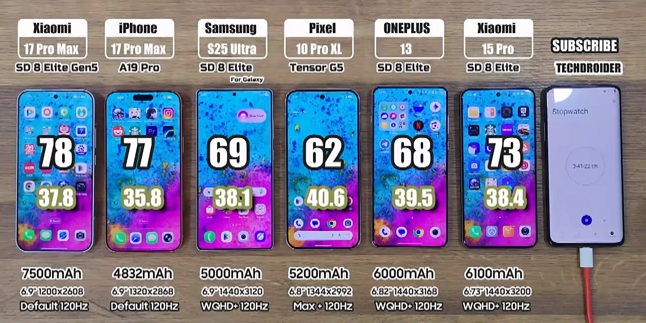 IT之家 10 月 8 日消息,YouTube 频道 TechDroider 昨日(10 月 7 日)发布最新视频,对比了小米 17 Pro Max、苹果 iPhone 17 Pro Max、三星 Galaxy S25 Ultra、小米 15 Pro、一加 13、谷歌 Pixel 10 Pro XL(顺序按照视频描述)这 6 款手机的续航能力。