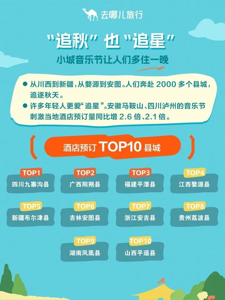 国庆中秋长假,去哪儿平台用户预订了全国2000多个县城的酒店。四川九寨沟景区人气爆棚,门票很早就售罄,九寨沟县也是全国酒店预订量最高的县城。热门县城还包括广西阳朔县、福建平潭县、江西婺源县等。