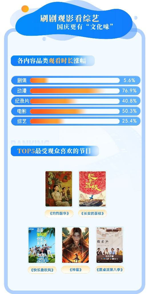 假期的线上文娱消费则呈现大屏化、沉浸式趋势。报告显示,国庆期间优酷观看时长增长主要来自大屏端,环比节前一周上涨23%。动漫、电影、综艺、纪录片四大品类涨幅最大,动漫类节目以76%的涨幅位居榜首。优酷工作人员分析称,以新国风为代表的国漫内容正在重塑客厅文化。随着80、90后成为父母,优质的国漫作品正成为连接两代人的娱乐新纽带。