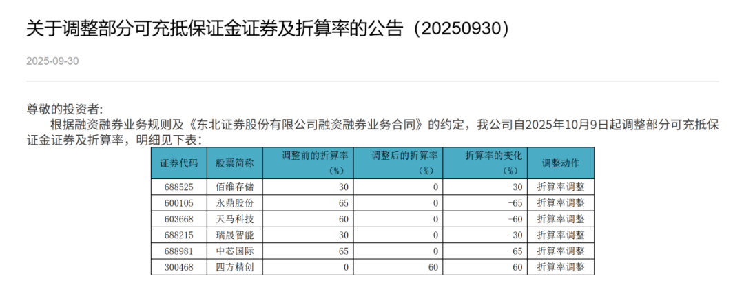 记者注意到,早在9月30日,包括东北证券、红塔证券(601236)在内的多家券商已经将中芯国际、佰维存储等多只股票的可充抵保证金证券及折算率进行了调整。