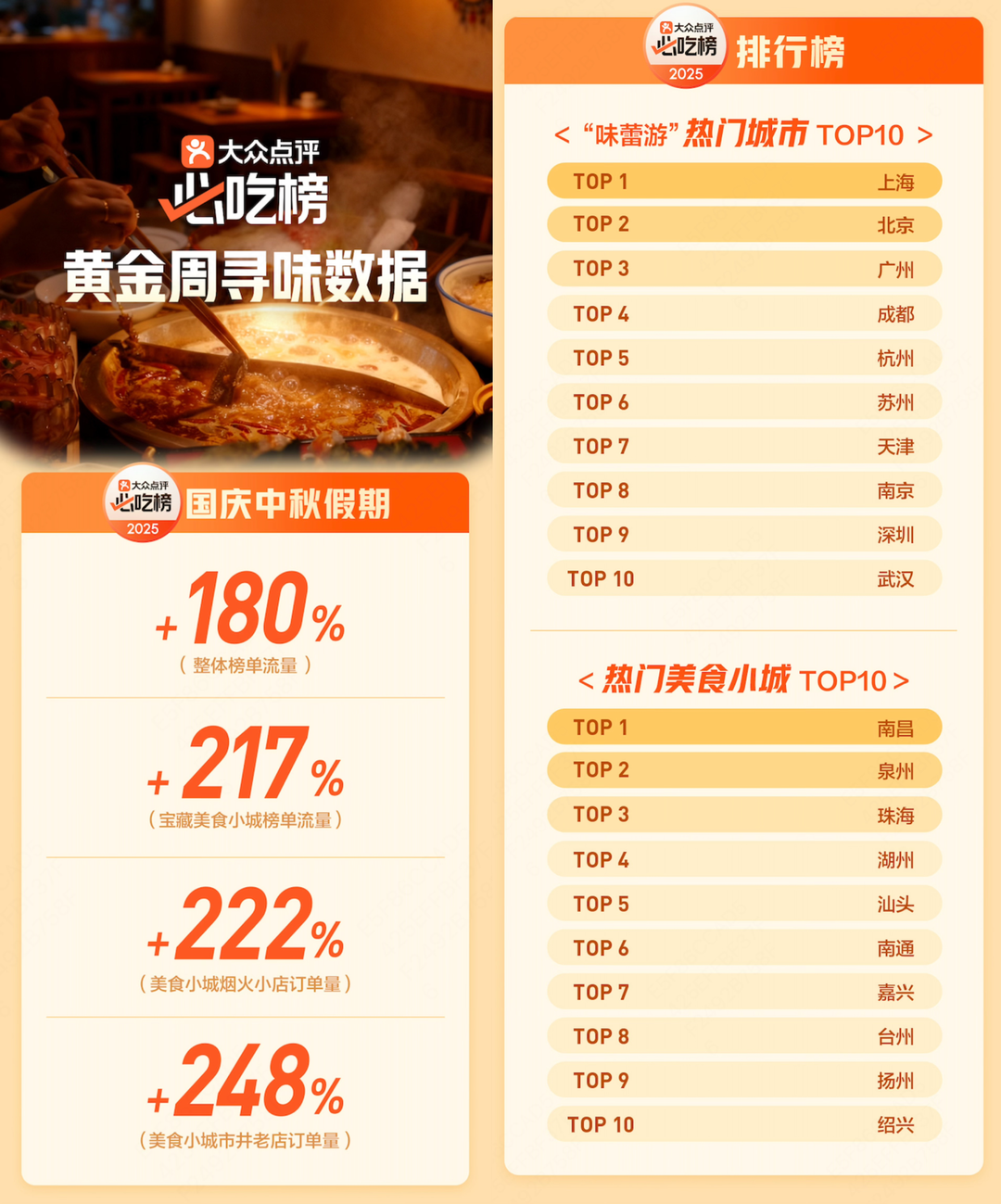 10月9日,大众点评发布黄金周数据。“十一”假期,“必吃榜”榜单流量整体环比上月增幅接近180%,上海、北京、广州、成都、杭州、苏州、天津、南京、深圳、武汉为“味蕾游”热门城市TOP10;小城小店变身“味蕾游黑马”,一众美食小城榜单流量涨超217%,带动当地上榜小店订单量涨超222%、上榜老店订单量涨超248%,南昌、泉州、珠海、湖州、汕头、南通、嘉兴、台州、扬州、绍兴为热门美食小城TOP10。