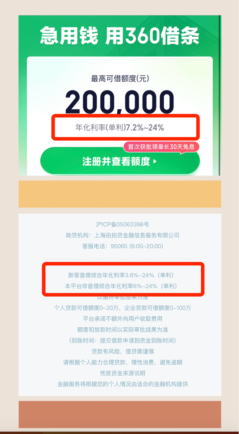 同时,本报记者在多个主流助贷平台的APP及小程序中看到,包括360、拍拍贷在内的多家头部机构也在首页尾部位置标注年化利率区间为“24%及以下”,最低费率则在7.2%左右,部分机构为首客提供的年化利率低至3.6%。