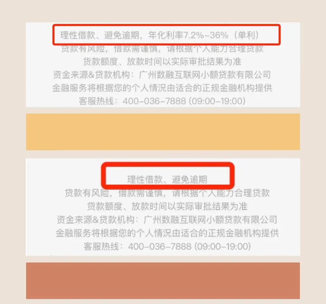 榕树贷款小程序利率说明对比图,上图为整改之前,下图为整改之后