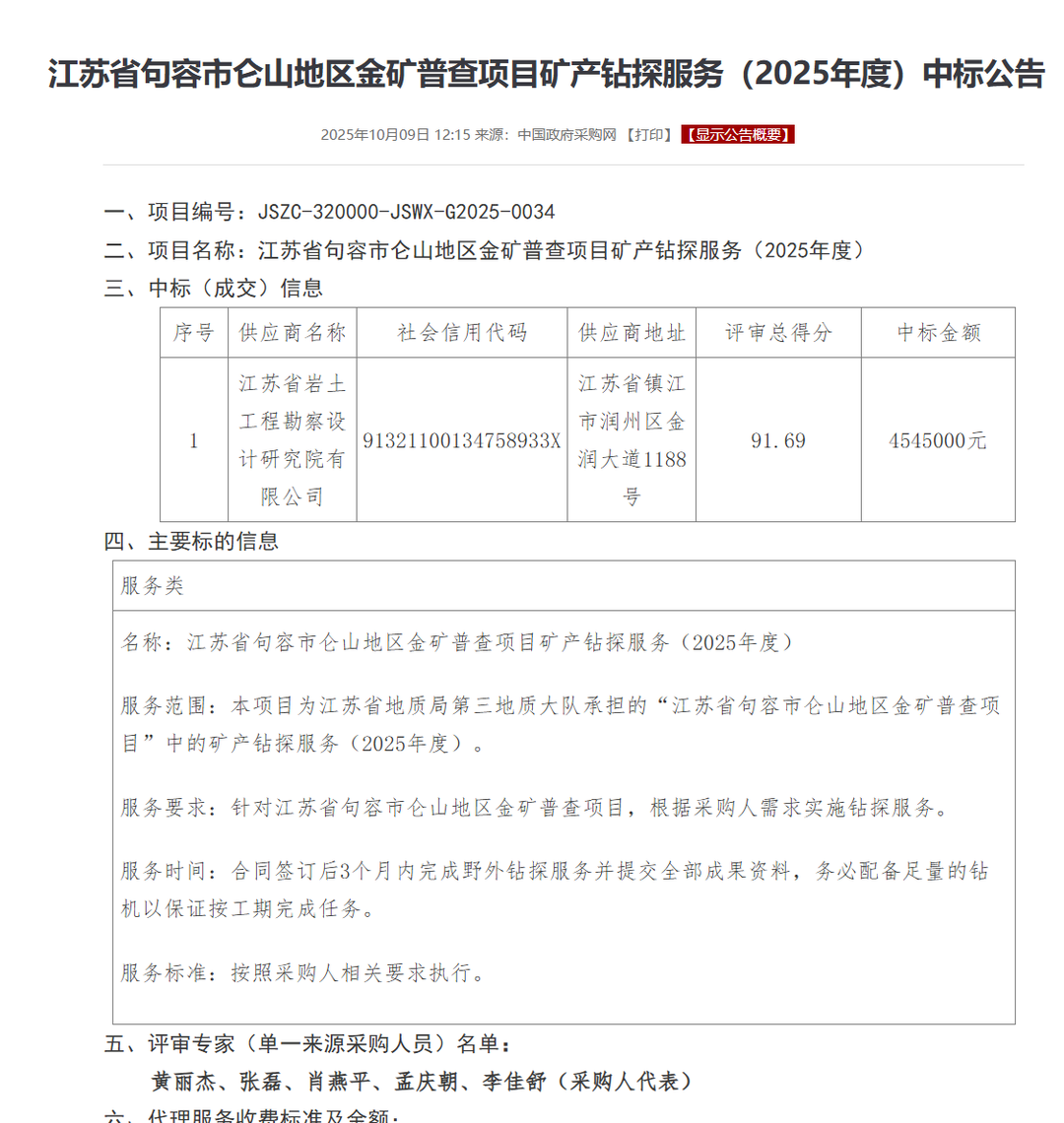 扬子晚报网10月10日讯(记者 万凌云 姜天圣)10月10日,扬子晚报/紫牛新闻记者从中国政府采购网了解到,镇江句容仑山地区金矿普查项目矿产钻探即将启动。中标公告显示,本项目为江苏省地质局第三地质大队承担的“江苏省句容市仑山地区金矿普查项目”中的矿产钻探服务,要求针对江苏省句容市仑山地区金矿普查项目,根据采购人需求实施钻探服务。