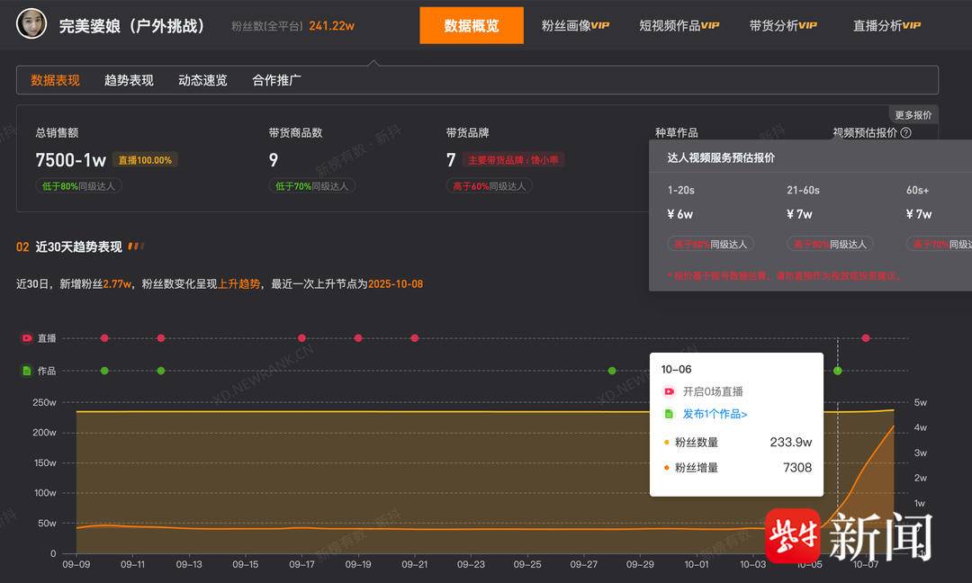 记者从社交平台了解到,这条短视频,为“完美婆娘”带来了7.31万的涨粉,其账号在视频平台上的粉丝总数已超过240万。更引人关注的是,随着人气飙升,其商业价值也水涨船高。第三方平台数据显示,她目前1-20秒视频广告预估报价为6万元,21-60秒及60秒以上视频广告预估报价已达7万元。
