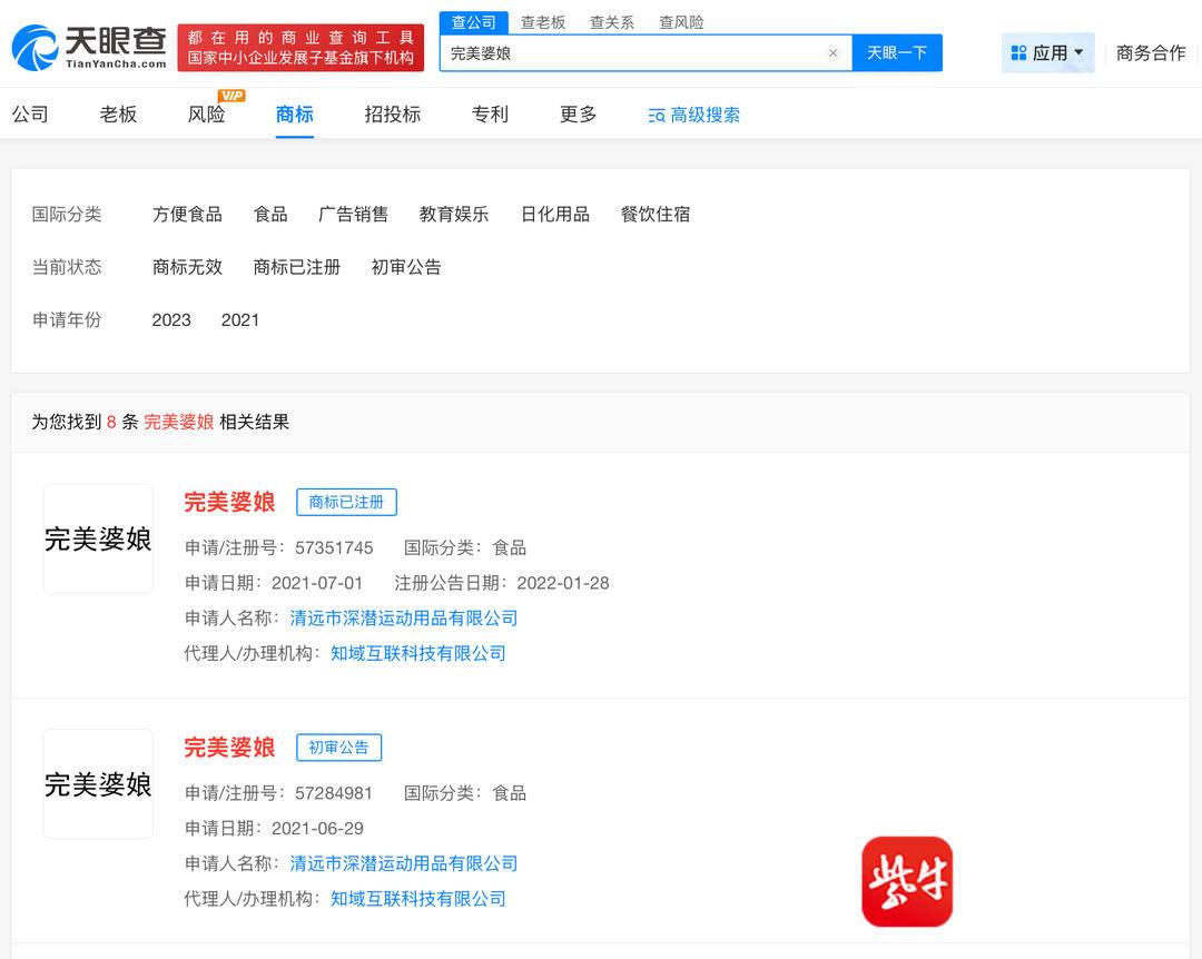 扬子晚报/紫牛新闻记者通过天眼查查询发现,“完美婆娘”已被近10家公司和个人申请注册为商标,申请人包括清远市某运动用品有限公司等,国际分类涵盖食品、方便食品等多个类别,目前部分商标已注册成功。扬子晚报/紫牛新闻记者 范晓林 陈哲 实习生魏静萱 视频拍摄剪辑 陈哲