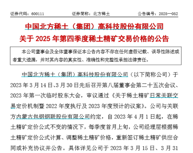 10月10日晚间,包钢股份(600010)、北方稀土(600111)发布公告,上调2025年第四季度稀土精矿关联交易价格。
